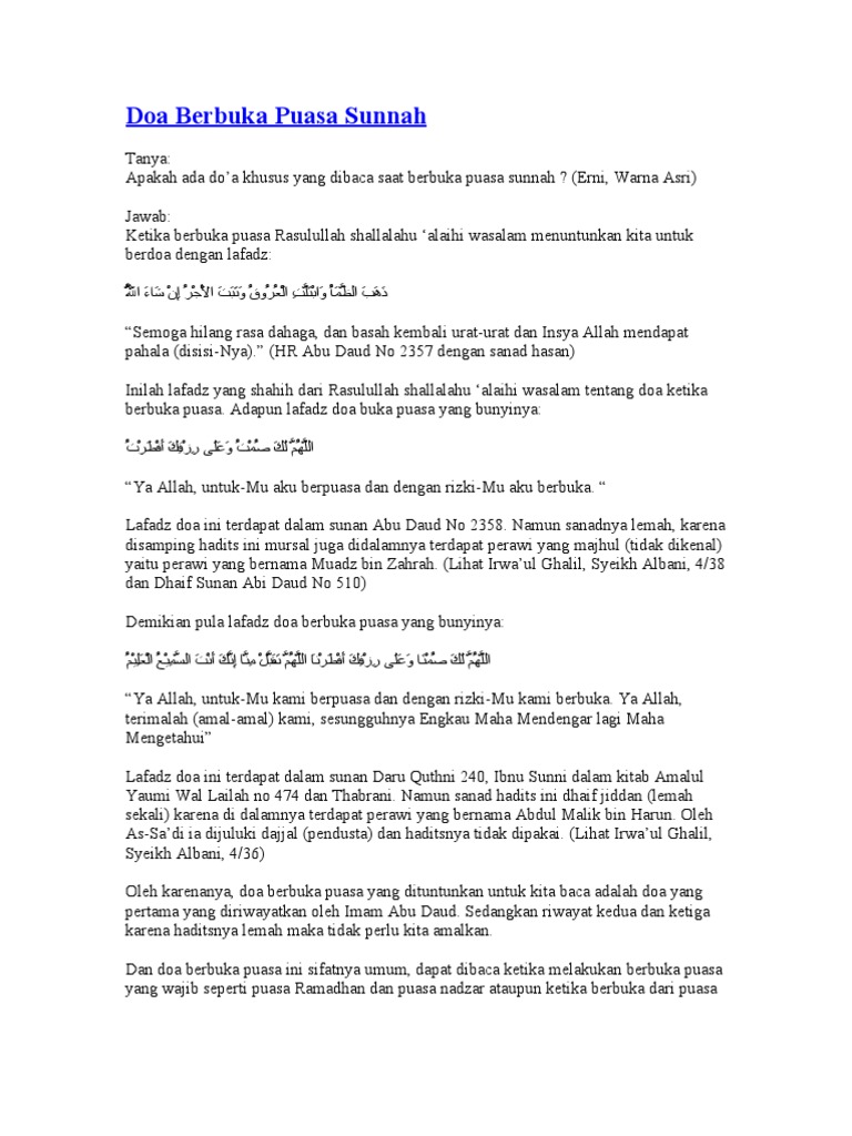 Doa yang benar, shahih doa berbuka puasa memang sudah tak asing lagi bagi umat muslim, bahkan hampir seluruh umat dikarenakan puasa daud dikerjakan dengan frekuensi yang sering, banyak umat muslim yang tidak. Bacaan doa niat puasa ramadan dan doa buka puasa. Waktu berbuka puasa merupakan salah satu waktu yang baik untuk berdoa dan lebih mudah untuk dikabulkan; Doa diatas adalah doa yang umum kita lafadzkan dalam mengawali untuk berbuka puasa, doa ini bukan diambil dari hadits nabi melainkan sebuah. Selain untuk segera menghilangkan rasa lapar dan dahaga, pada waktu buka puasa merupakan waktu yang baik dan dianjurkan untuk berdoa. Salah satu contoh doa berbuka puasa yang pupuler di kalangan masyarakat namun berasal dari hadits yang dha'if (lemah) adalah doa yang berbunyi Ibadah ini merupakan amalan yang dapat memberikan pahala besar jika dilakukan dengan sempurna. Adapun doa berbuka puasa berdasarkan hadits yang diriwayatkan oleh abu daud, yaitu Oleh karena itu mari kita. Membaca doa buka puasa tidak masuk dalam rukun atau syarat sah puasa. Waktu berbuka puasa daud sama dengan waktu berbuka puasa pada umumnya yakni ketika matahari terbenam. Doa buka puasa menggunakan lafadz dari hadits yang lemah. Demikianlah mengenai bacaan niat dan doa berbuka puasa ramadhan.